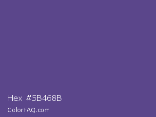 Hex #5b468b Color is a normal indigo color and the nearest color is Victoria #534491. Hex code #5b468b and RGB value is rgb(91,70,139). In RGB color space, this color is composed of 36% red, 27% green, 55% blue, In CMYK color space, this color is composed of 35% cyan, 50% magenta, 0% yellow , 45% black , In HSL color space, this color has a hue angle of 258° , 33% saturation and 41% lightness.
