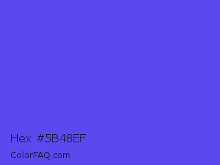 Hex #5b48ef Color is a light indigo color and the nearest color is Majorelle Blue #6050dc. Hex code #5b48ef and RGB value is rgb(91,72,239). In RGB color space, this color is composed of 36% red, 28% green, 94% blue, In CMYK color space, this color is composed of 62% cyan, 70% magenta, 0% yellow , 6% black , In HSL color space, this color has a hue angle of 247° , 84% saturation and 61% lightness.