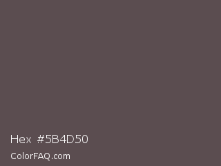 Hex #5b4d50 Color is a normal red color and the nearest color is Don Juan #5d4c51. Hex code #5b4d50 and RGB value is rgb(91,77,80). In RGB color space, this color is composed of 36% red, 30% green, 31% blue, In CMYK color space, this color is composed of 0% cyan, 15% magenta, 12% yellow , 64% black , In HSL color space, this color has a hue angle of 347° , 8% saturation and 33% lightness.