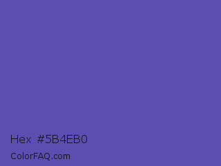 Hex #5b4eb0 Color is a normal indigo color and the nearest color is Plump Purple #5946b2. Hex code #5b4eb0 and RGB value is rgb(91,78,176). In RGB color space, this color is composed of 36% red, 31% green, 69% blue, In CMYK color space, this color is composed of 48% cyan, 56% magenta, 0% yellow , 31% black , In HSL color space, this color has a hue angle of 248° , 39% saturation and 50% lightness.