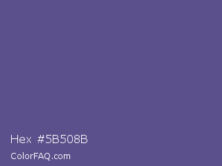 Hex #5b508b Color is a normal indigo color and the nearest color is Victoria #534491. Hex code #5b508b and RGB value is rgb(91,80,139). In RGB color space, this color is composed of 36% red, 31% green, 55% blue, In CMYK color space, this color is composed of 35% cyan, 42% magenta, 0% yellow , 45% black , In HSL color space, this color has a hue angle of 251° , 27% saturation and 43% lightness.