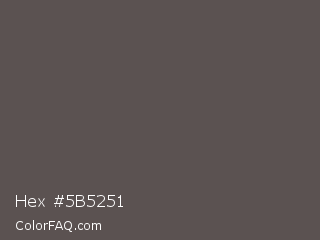 Hex #5b5251 Color is a normal red color and the nearest color is Don Juan #5d4c51. Hex code #5b5251 and RGB value is rgb(91,82,81). In RGB color space, this color is composed of 36% red, 32% green, 32% blue, In CMYK color space, this color is composed of 0% cyan, 10% magenta, 11% yellow , 64% black , In HSL color space, this color has a hue angle of 6° , 6% saturation and 34% lightness.