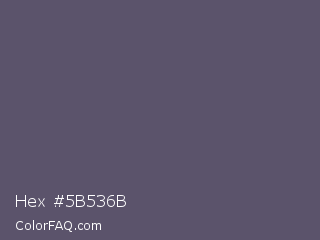 Hex #5b536b Color is a normal indigo color and the nearest color is Scarpa Flow #585562. Hex code #5b536b and RGB value is rgb(91,83,107). In RGB color space, this color is composed of 36% red, 33% green, 42% blue, In CMYK color space, this color is composed of 15% cyan, 22% magenta, 0% yellow , 58% black , In HSL color space, this color has a hue angle of 260° , 13% saturation and 37% lightness.