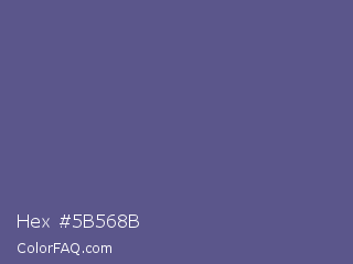 Hex #5b568b Color is a normal indigo color and the nearest color is Purple Navy #4e5180. Hex code #5b568b and RGB value is rgb(91,86,139). In RGB color space, this color is composed of 36% red, 34% green, 55% blue, In CMYK color space, this color is composed of 35% cyan, 38% magenta, 0% yellow , 45% black , In HSL color space, this color has a hue angle of 246° , 24% saturation and 44% lightness.