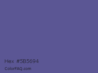 Hex #5b5694 Color is a normal indigo color and the nearest color is Butterfly Bush #624e9a. Hex code #5b5694 and RGB value is rgb(91,86,148). In RGB color space, this color is composed of 36% red, 34% green, 58% blue, In CMYK color space, this color is composed of 39% cyan, 42% magenta, 0% yellow , 42% black , In HSL color space, this color has a hue angle of 245° , 26% saturation and 46% lightness.