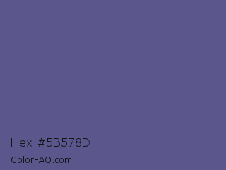 Hex #5b578d Color is a normal indigo color and the nearest color is Butterfly Bush #624e9a. Hex code #5b578d and RGB value is rgb(91,87,141). In RGB color space, this color is composed of 36% red, 34% green, 55% blue, In CMYK color space, this color is composed of 35% cyan, 38% magenta, 0% yellow , 45% black , In HSL color space, this color has a hue angle of 244° , 24% saturation and 45% lightness.