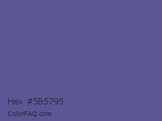 Hex #5b5795 Color is a normal indigo color and the nearest color is Butterfly Bush #624e9a. Hex code #5b5795 and RGB value is rgb(91,87,149). In RGB color space, this color is composed of 36% red, 34% green, 58% blue, In CMYK color space, this color is composed of 39% cyan, 42% magenta, 0% yellow , 42% black , In HSL color space, this color has a hue angle of 244° , 26% saturation and 46% lightness.