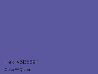 Hex #5b589f Color is a normal indigo color and the nearest color is Liberty #545aa7. Hex code #5b589f and RGB value is rgb(91,88,159). In RGB color space, this color is composed of 36% red, 35% green, 62% blue, In CMYK color space, this color is composed of 43% cyan, 45% magenta, 0% yellow , 38% black , In HSL color space, this color has a hue angle of 243° , 29% saturation and 48% lightness.