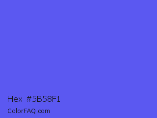 Hex #5b58f1 Color is a light indigo color and the nearest color is Very Light Blue #6666ff. Hex code #5b58f1 and RGB value is rgb(91,88,241). In RGB color space, this color is composed of 36% red, 35% green, 95% blue, In CMYK color space, this color is composed of 62% cyan, 63% magenta, 0% yellow , 5% black , In HSL color space, this color has a hue angle of 241° , 85% saturation and 65% lightness.