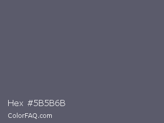 Hex #5b5b6b Color is a normal blue color and the nearest color is Mid Gray #5f5f6e. Hex code #5b5b6b and RGB value is rgb(91,91,107). In RGB color space, this color is composed of 36% red, 36% green, 42% blue, In CMYK color space, this color is composed of 15% cyan, 15% magenta, 0% yellow , 58% black , In HSL color space, this color has a hue angle of 240° , 8% saturation and 39% lightness.