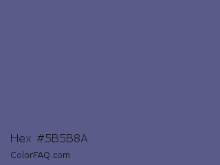 Hex #5b5b8a Color is a normal blue color and the nearest color is UCLA Blue #536895. Hex code #5b5b8a and RGB value is rgb(91,91,138). In RGB color space, this color is composed of 36% red, 36% green, 54% blue, In CMYK color space, this color is composed of 34% cyan, 34% magenta, 0% yellow , 46% black , In HSL color space, this color has a hue angle of 240° , 21% saturation and 45% lightness.