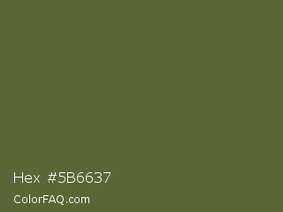 Hex #5b6637 Color is a normal lime color and the nearest color is Verdigris #5d5e37. Hex code #5b6637 and RGB value is rgb(91,102,55). In RGB color space, this color is composed of 36% red, 40% green, 22% blue, In CMYK color space, this color is composed of 11% cyan, 0% magenta, 46% yellow , 60% black , In HSL color space, this color has a hue angle of 74° , 30% saturation and 31% lightness.