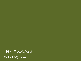 Hex #5b6a28 Color is a dark lime color and the nearest color is Dark Olive Green #556b2f. Hex code #5b6a28 and RGB value is rgb(91,106,40). In RGB color space, this color is composed of 36% red, 42% green, 16% blue, In CMYK color space, this color is composed of 14% cyan, 0% magenta, 62% yellow , 58% black , In HSL color space, this color has a hue angle of 74° , 45% saturation and 29% lightness.