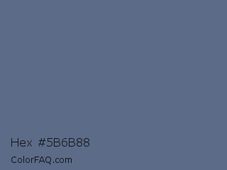 Hex #5b6b88 Color is a normal blue color and the nearest color is UCLA Blue #536895. Hex code #5b6b88 and RGB value is rgb(91,107,136). In RGB color space, this color is composed of 36% red, 42% green, 53% blue, In CMYK color space, this color is composed of 33% cyan, 21% magenta, 0% yellow , 47% black , In HSL color space, this color has a hue angle of 219° , 20% saturation and 45% lightness.