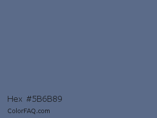 Hex #5b6b89 Color is a normal blue color and the nearest color is UCLA Blue #536895. Hex code #5b6b89 and RGB value is rgb(91,107,137). In RGB color space, this color is composed of 36% red, 42% green, 54% blue, In CMYK color space, this color is composed of 34% cyan, 22% magenta, 0% yellow , 46% black , In HSL color space, this color has a hue angle of 219° , 20% saturation and 45% lightness.