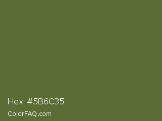 Hex #5b6c35 Color is a normal lime color and the nearest color is Dark Olive Green #556b2f. Hex code #5b6c35 and RGB value is rgb(91,108,53). In RGB color space, this color is composed of 36% red, 42% green, 21% blue, In CMYK color space, this color is composed of 16% cyan, 0% magenta, 51% yellow , 58% black , In HSL color space, this color has a hue angle of 79° , 34% saturation and 32% lightness.