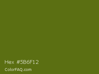 Hex #5b6f12 Color is a dark lime color and the nearest color is Fern Frond #657220. Hex code #5b6f12 and RGB value is rgb(91,111,18). In RGB color space, this color is composed of 36% red, 44% green, 7% blue, In CMYK color space, this color is composed of 18% cyan, 0% magenta, 84% yellow , 56% black , In HSL color space, this color has a hue angle of 73° , 72% saturation and 25% lightness.