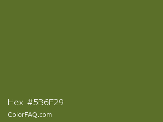 Hex #5b6f29 Color is a dark lime color and the nearest color is Dark Olive Green #556b2f. Hex code #5b6f29 and RGB value is rgb(91,111,41). In RGB color space, this color is composed of 36% red, 44% green, 16% blue, In CMYK color space, this color is composed of 18% cyan, 0% magenta, 63% yellow , 56% black , In HSL color space, this color has a hue angle of 77° , 46% saturation and 30% lightness.