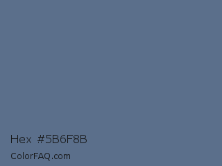 Hex #5b6f8b Color is a normal blue color and the nearest color is UCLA Blue #536895. Hex code #5b6f8b and RGB value is rgb(91,111,139). In RGB color space, this color is composed of 36% red, 44% green, 55% blue, In CMYK color space, this color is composed of 35% cyan, 20% magenta, 0% yellow , 45% black , In HSL color space, this color has a hue angle of 215° , 21% saturation and 45% lightness.