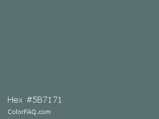 Hex #5b7171 Color is a normal cyan color and the nearest color is Nevada #646e75. Hex code #5b7171 and RGB value is rgb(91,113,113). In RGB color space, this color is composed of 36% red, 44% green, 44% blue, In CMYK color space, this color is composed of 19% cyan, 0% magenta, 0% yellow , 56% black , In HSL color space, this color has a hue angle of 180° , 11% saturation and 40% lightness.