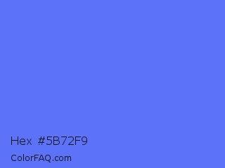 Hex #5b72f9 Color is a light blue color and the nearest color is Very Light Blue #6666ff. Hex code #5b72f9 and RGB value is rgb(91,114,249). In RGB color space, this color is composed of 36% red, 45% green, 98% blue, In CMYK color space, this color is composed of 63% cyan, 54% magenta, 0% yellow , 2% black , In HSL color space, this color has a hue angle of 231° , 93% saturation and 67% lightness.