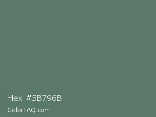 Hex #5b796b Color is a normal green color and the nearest color is Como #517c66. Hex code #5b796b and RGB value is rgb(91,121,107). In RGB color space, this color is composed of 36% red, 47% green, 42% blue, In CMYK color space, this color is composed of 25% cyan, 0% magenta, 12% yellow , 53% black , In HSL color space, this color has a hue angle of 152° , 14% saturation and 42% lightness.