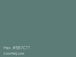 Hex #5b7c77 Color is a normal cyan color and the nearest color is Cutty Sark #507672. Hex code #5b7c77 and RGB value is rgb(91,124,119). In RGB color space, this color is composed of 36% red, 49% green, 47% blue, In CMYK color space, this color is composed of 27% cyan, 0% magenta, 4% yellow , 51% black , In HSL color space, this color has a hue angle of 171° , 15% saturation and 42% lightness.
