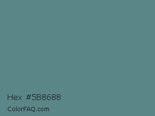 Hex #5b8688 Color is a normal cyan color and the nearest color is Steel Teal #5f8a8b. Hex code #5b8688 and RGB value is rgb(91,134,136). In RGB color space, this color is composed of 36% red, 53% green, 53% blue, In CMYK color space, this color is composed of 33% cyan, 1% magenta, 0% yellow , 47% black , In HSL color space, this color has a hue angle of 183° , 20% saturation and 45% lightness.