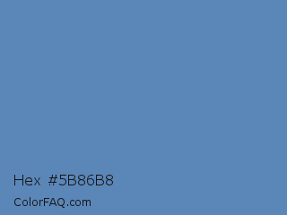 Hex #5b86b8 Color is a normal blue color and the nearest color is Silver Lake Blue #5d89ba. Hex code #5b86b8 and RGB value is rgb(91,134,184). In RGB color space, this color is composed of 36% red, 53% green, 72% blue, In CMYK color space, this color is composed of 51% cyan, 27% magenta, 0% yellow , 28% black , In HSL color space, this color has a hue angle of 212° , 40% saturation and 54% lightness.