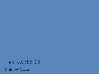 Hex #5b86bd Color is a normal blue color and the nearest color is Silver Lake Blue #5d89ba. Hex code #5b86bd and RGB value is rgb(91,134,189). In RGB color space, this color is composed of 36% red, 53% green, 74% blue, In CMYK color space, this color is composed of 52% cyan, 29% magenta, 0% yellow , 26% black , In HSL color space, this color has a hue angle of 214° , 43% saturation and 55% lightness.