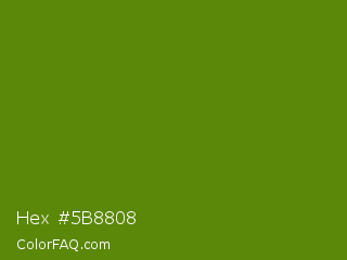 Hex #5b8808 Color is a dark green color and the nearest color is Avocado #568203. Hex code #5b8808 and RGB value is rgb(91,136,8). In RGB color space, this color is composed of 36% red, 53% green, 3% blue, In CMYK color space, this color is composed of 33% cyan, 0% magenta, 94% yellow , 47% black , In HSL color space, this color has a hue angle of 81° , 89% saturation and 28% lightness.