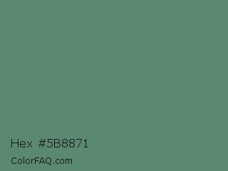 Hex #5b8871 Color is a normal green color and the nearest color is Viridian Green #678975. Hex code #5b8871 and RGB value is rgb(91,136,113). In RGB color space, this color is composed of 36% red, 53% green, 44% blue, In CMYK color space, this color is composed of 33% cyan, 0% magenta, 17% yellow , 47% black , In HSL color space, this color has a hue angle of 149° , 20% saturation and 45% lightness.