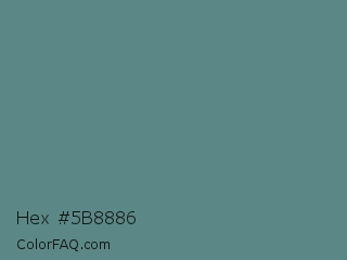 Hex #5b8886 Color is a normal cyan color and the nearest color is Steel Teal #5f8a8b. Hex code #5b8886 and RGB value is rgb(91,136,134). In RGB color space, this color is composed of 36% red, 53% green, 53% blue, In CMYK color space, this color is composed of 33% cyan, 0% magenta, 1% yellow , 47% black , In HSL color space, this color has a hue angle of 177° , 20% saturation and 45% lightness.