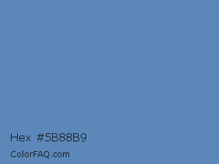 Hex #5b88b9 Color is a normal blue color and the nearest color is Silver Lake Blue #5d89ba. Hex code #5b88b9 and RGB value is rgb(91,136,185). In RGB color space, this color is composed of 36% red, 53% green, 73% blue, In CMYK color space, this color is composed of 51% cyan, 26% magenta, 0% yellow , 27% black , In HSL color space, this color has a hue angle of 211° , 40% saturation and 54% lightness.