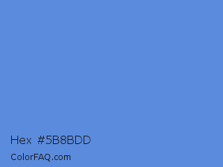 Hex #5b8bdd Color is a light blue color and the nearest color is Havelock Blue #5590d9. Hex code #5b8bdd and RGB value is rgb(91,139,221). In RGB color space, this color is composed of 36% red, 55% green, 87% blue, In CMYK color space, this color is composed of 59% cyan, 37% magenta, 0% yellow , 13% black , In HSL color space, this color has a hue angle of 218° , 66% saturation and 61% lightness.