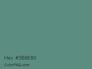 Hex #5b8e80 Color is a normal cyan color and the nearest color is Wintergreen Dream #56887d. Hex code #5b8e80 and RGB value is rgb(91,142,128). In RGB color space, this color is composed of 36% red, 56% green, 50% blue, In CMYK color space, this color is composed of 36% cyan, 0% magenta, 10% yellow , 44% black , In HSL color space, this color has a hue angle of 164° , 22% saturation and 46% lightness.