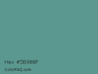Hex #5b988f Color is a normal cyan color and the nearest color is Patina #639a8f. Hex code #5b988f and RGB value is rgb(91,152,143). In RGB color space, this color is composed of 36% red, 60% green, 56% blue, In CMYK color space, this color is composed of 40% cyan, 0% magenta, 6% yellow , 40% black , In HSL color space, this color has a hue angle of 171° , 25% saturation and 48% lightness.