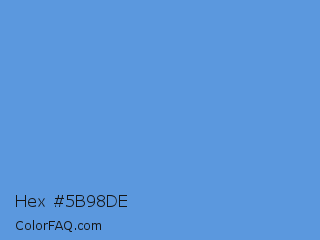 Hex #5b98de Color is a light blue color and the nearest color is United Nations Blue #5b92e5. Hex code #5b98de and RGB value is rgb(91,152,222). In RGB color space, this color is composed of 36% red, 60% green, 87% blue, In CMYK color space, this color is composed of 59% cyan, 32% magenta, 0% yellow , 13% black , In HSL color space, this color has a hue angle of 212° , 66% saturation and 61% lightness.