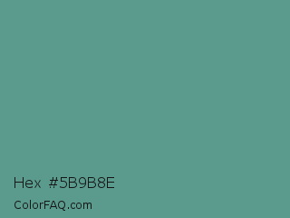 Hex #5b9b8e Color is a normal cyan color and the nearest color is Patina #639a8f. Hex code #5b9b8e and RGB value is rgb(91,155,142). In RGB color space, this color is composed of 36% red, 61% green, 56% blue, In CMYK color space, this color is composed of 41% cyan, 0% magenta, 8% yellow , 39% black , In HSL color space, this color has a hue angle of 168° , 26% saturation and 48% lightness.