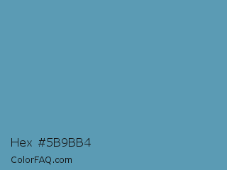 Hex #5b9bb4 Color is a normal blue color and the nearest color is Hippie Blue #589aaf. Hex code #5b9bb4 and RGB value is rgb(91,155,180). In RGB color space, this color is composed of 36% red, 61% green, 71% blue, In CMYK color space, this color is composed of 49% cyan, 14% magenta, 0% yellow , 29% black , In HSL color space, this color has a hue angle of 197° , 37% saturation and 53% lightness.