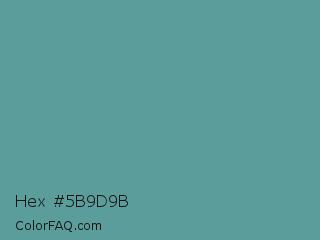 Hex #5b9d9b Color is a normal cyan color and the nearest color is Breaker Bay #5da19f. Hex code #5b9d9b and RGB value is rgb(91,157,155). In RGB color space, this color is composed of 36% red, 62% green, 61% blue, In CMYK color space, this color is composed of 42% cyan, 0% magenta, 1% yellow , 38% black , In HSL color space, this color has a hue angle of 178° , 27% saturation and 49% lightness.