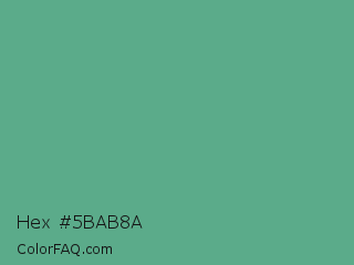Hex #5bab8a Color is a normal green color and the nearest color is Polished Pine #5da493. Hex code #5bab8a and RGB value is rgb(91,171,138). In RGB color space, this color is composed of 36% red, 67% green, 54% blue, In CMYK color space, this color is composed of 47% cyan, 0% magenta, 19% yellow , 33% black , In HSL color space, this color has a hue angle of 155° , 32% saturation and 51% lightness.