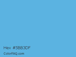 Hex #5bb3df Color is a light blue color and the nearest color is Blue Jeans #5dadec. Hex code #5bb3df and RGB value is rgb(91,179,223). In RGB color space, this color is composed of 36% red, 70% green, 87% blue, In CMYK color space, this color is composed of 59% cyan, 20% magenta, 0% yellow , 13% black , In HSL color space, this color has a hue angle of 200° , 67% saturation and 62% lightness.