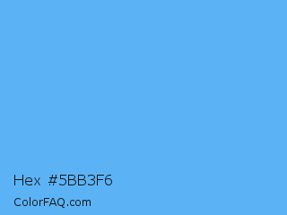 Hex #5bb3f6 Color is a light blue color and the nearest color is Blue Jeans #5dadec. Hex code #5bb3f6 and RGB value is rgb(91,179,246). In RGB color space, this color is composed of 36% red, 70% green, 96% blue, In CMYK color space, this color is composed of 63% cyan, 27% magenta, 0% yellow , 4% black , In HSL color space, this color has a hue angle of 206° , 90% saturation and 66% lightness.