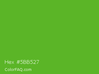 Hex #5bb527 Color is a normal green color and the nearest color is Green RYB #66b032. Hex code #5bb527 and RGB value is rgb(91,181,39). In RGB color space, this color is composed of 36% red, 71% green, 15% blue, In CMYK color space, this color is composed of 50% cyan, 0% magenta, 78% yellow , 29% black , In HSL color space, this color has a hue angle of 98° , 65% saturation and 43% lightness.