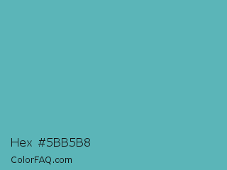 Hex #5bb5b8 Color is a normal cyan color and the nearest color is Fountain Blue #56b4be. Hex code #5bb5b8 and RGB value is rgb(91,181,184). In RGB color space, this color is composed of 36% red, 71% green, 72% blue, In CMYK color space, this color is composed of 51% cyan, 2% magenta, 0% yellow , 28% black , In HSL color space, this color has a hue angle of 182° , 40% saturation and 54% lightness.