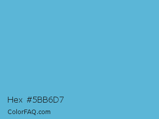 Hex #5bb6d7 Color is a normal blue color and the nearest color is Shakespeare #4eabd1. Hex code #5bb6d7 and RGB value is rgb(91,182,215). In RGB color space, this color is composed of 36% red, 71% green, 84% blue, In CMYK color space, this color is composed of 58% cyan, 15% magenta, 0% yellow , 16% black , In HSL color space, this color has a hue angle of 196° , 61% saturation and 60% lightness.