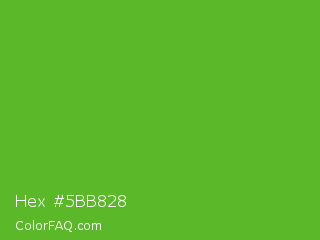 Hex #5bb828 Color is a normal green color and the nearest color is Green RYB #66b032. Hex code #5bb828 and RGB value is rgb(91,184,40). In RGB color space, this color is composed of 36% red, 72% green, 16% blue, In CMYK color space, this color is composed of 51% cyan, 0% magenta, 78% yellow , 28% black , In HSL color space, this color has a hue angle of 99° , 64% saturation and 44% lightness.