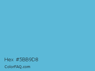 Hex #5bb9d8 Color is a normal blue color and the nearest color is Shakespeare #4eabd1. Hex code #5bb9d8 and RGB value is rgb(91,185,216). In RGB color space, this color is composed of 36% red, 73% green, 85% blue, In CMYK color space, this color is composed of 58% cyan, 14% magenta, 0% yellow , 15% black , In HSL color space, this color has a hue angle of 195° , 62% saturation and 60% lightness.