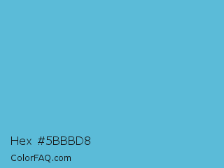 Hex #5bbbd8 Color is a normal blue color and the nearest color is Viking #64ccdb. Hex code #5bbbd8 and RGB value is rgb(91,187,216). In RGB color space, this color is composed of 36% red, 73% green, 85% blue, In CMYK color space, this color is composed of 58% cyan, 13% magenta, 0% yellow , 15% black , In HSL color space, this color has a hue angle of 194° , 62% saturation and 60% lightness.